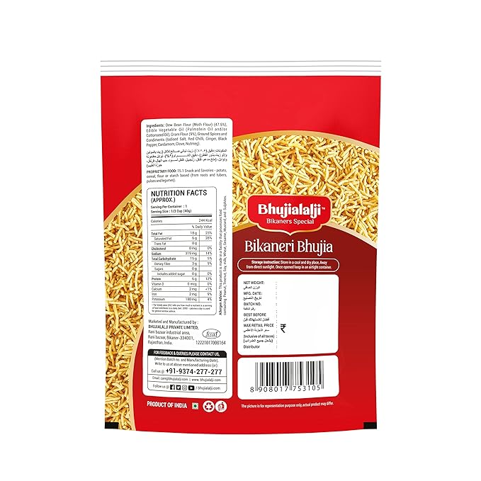 - Introducing Bhujialalji Bikaneri Bhujia – A Royal Rajasthani Delight! Discover the true taste of Rajasthan with Bhujialalji Bikaneri Bhujia. This pack is filled with the all-time favorite Rajasthani namkeen that combines the richness of dew beans, gram flour, and authentic Indian spices. Indulge in the regal flavors of Bhujialalji Bikaneri Bhujia.