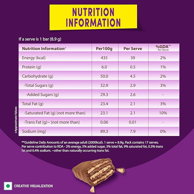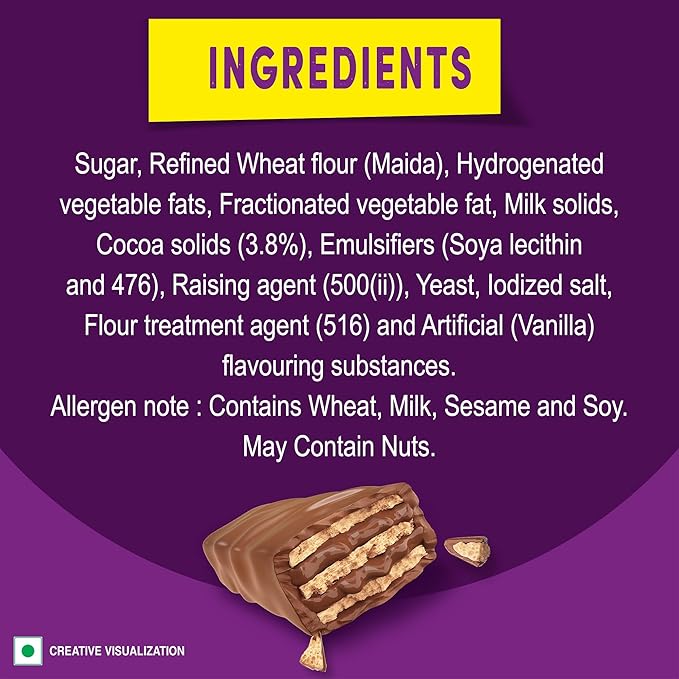 Sugar, Refined Wheat flour (Maida), Hydrogenated vegetable fats, Fractionated vegetable fat, Milk solids, Cocoa solids (3.8%), Emulsifiers (Soya lecithin and 476), Raising agent (500(ii)), Yeast, lodized salt, Flour treatment agent (516) and Artificial (Vanilla) flavouring substances. Allergen note: Contains Wheat, Milk, Sesame and Soy. May Contain Nuts.